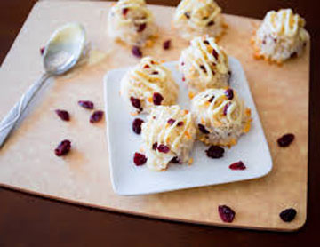 In a bowl, whip together egg whites, sugar, vanilla and salt in a large bowl until frothy: Fold chopped cranberries and one 14-ounce package sweetened shredded coconut. Form into 30 tablespoon-size pyramids on a baking sheet coated with cooking spray. Bake at 325 degree F until it golden, wait for 20 to 25 minutes cooling it and then serve it with melted white chocolate.
