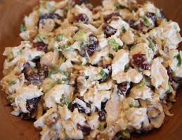 In a bowl whip together yoghurt, mustard and salt. Add the shredded chicken, walnuts, cranberries and scallions and toss with the dressing Refrigerate till ready to use.